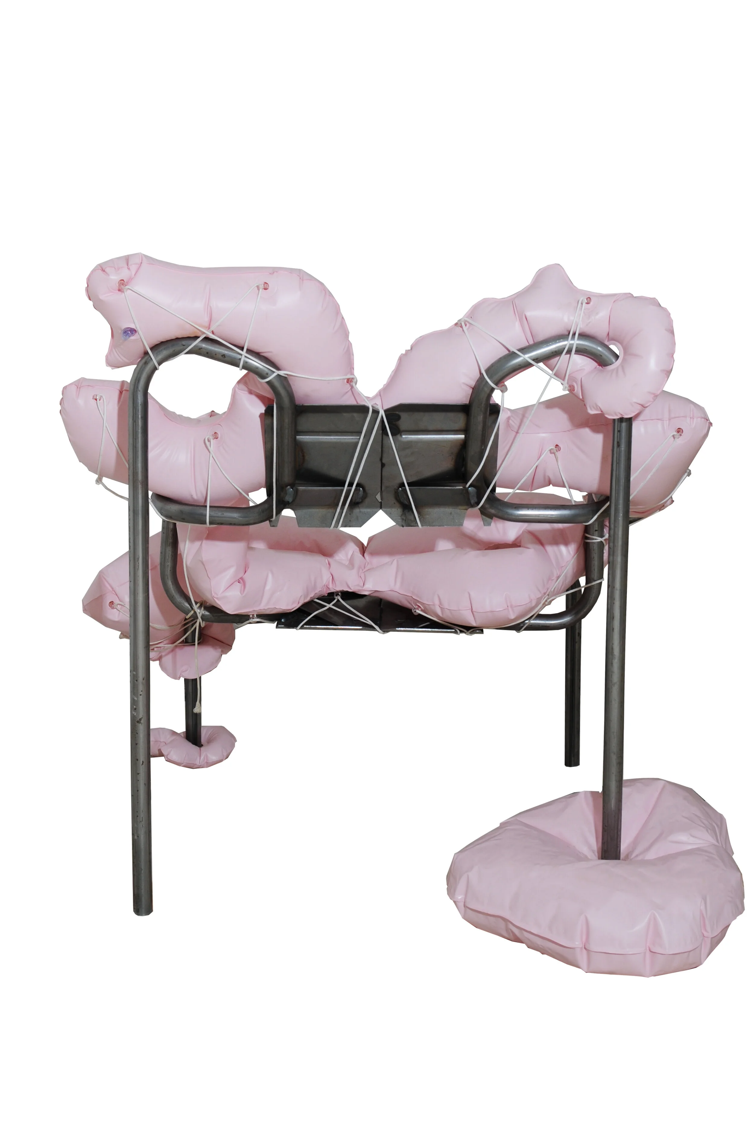 This Ekstrem™ has an open framework consisting of two identical mirror-facing raw steel frames. Inflatable parts reminiscing the left overs of a chewing gum is intertwined with the steel frame.